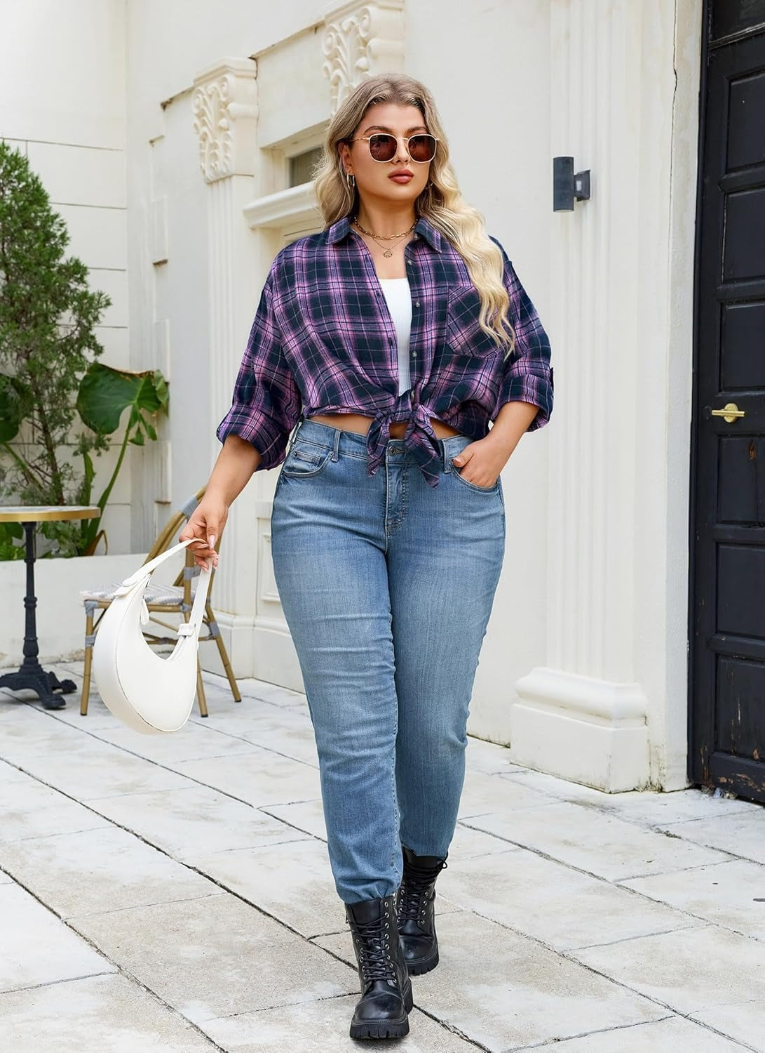 - The stylish boyfriend plaid shirts can be paired with jeans, tank tops, shorts, skirts, bodysuits, sneakers, or high heels; various combinations will make you look stylish. The button down tartan shirt is a must-have for ladies' fashion