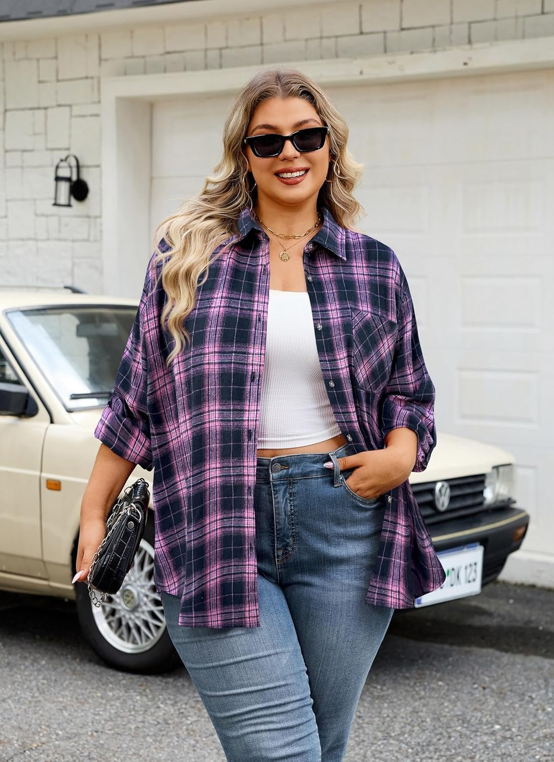 Womens Plus Size Flannel Shirts Long Sleeve Button Down Plaid Shirt Oversize