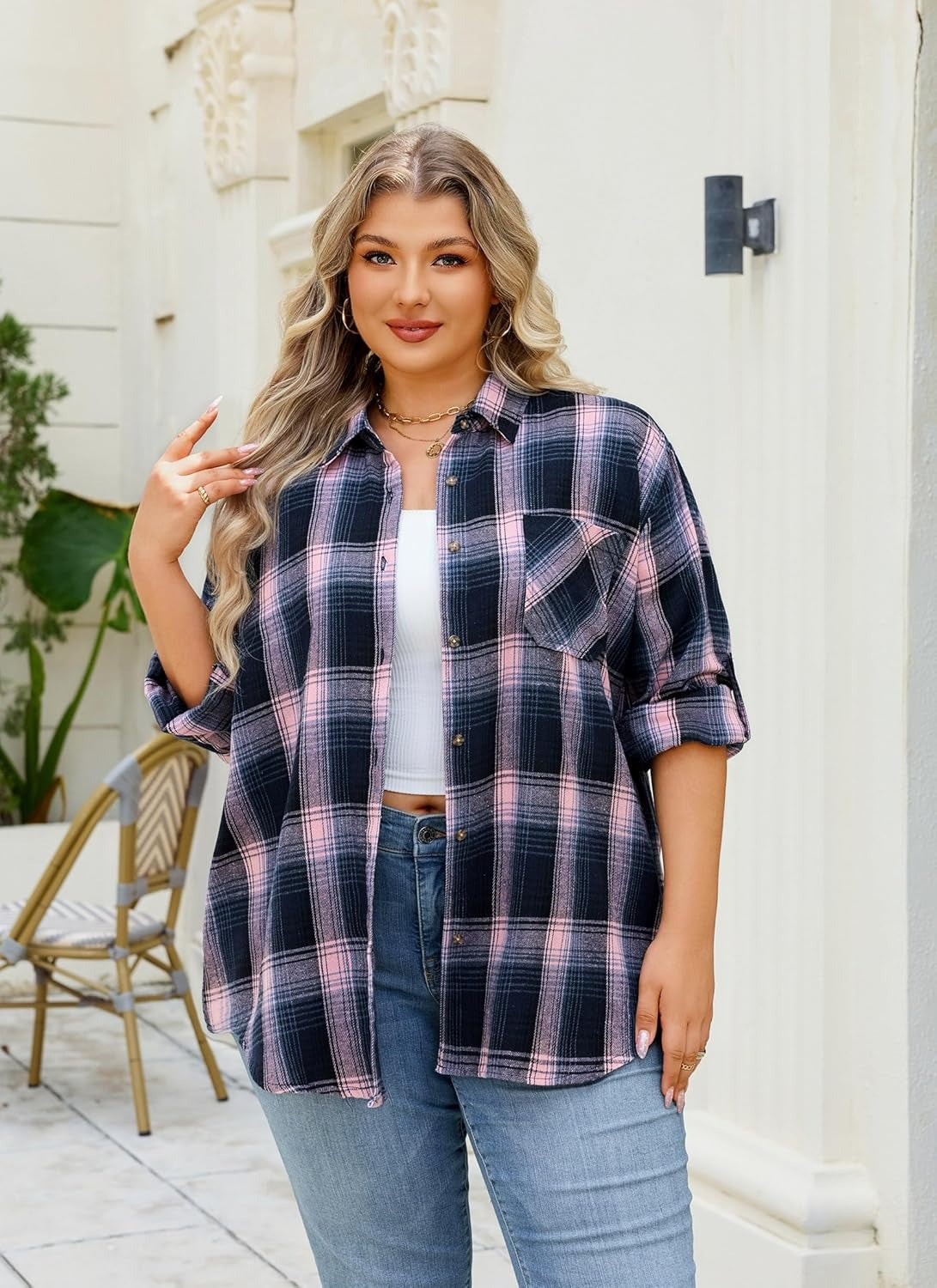 Womens Plus Size Flannel Shirts Long Sleeve Button Down Plaid Shirt Oversize
